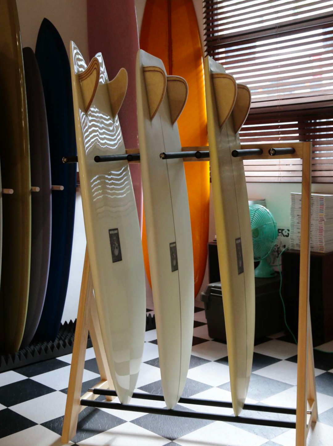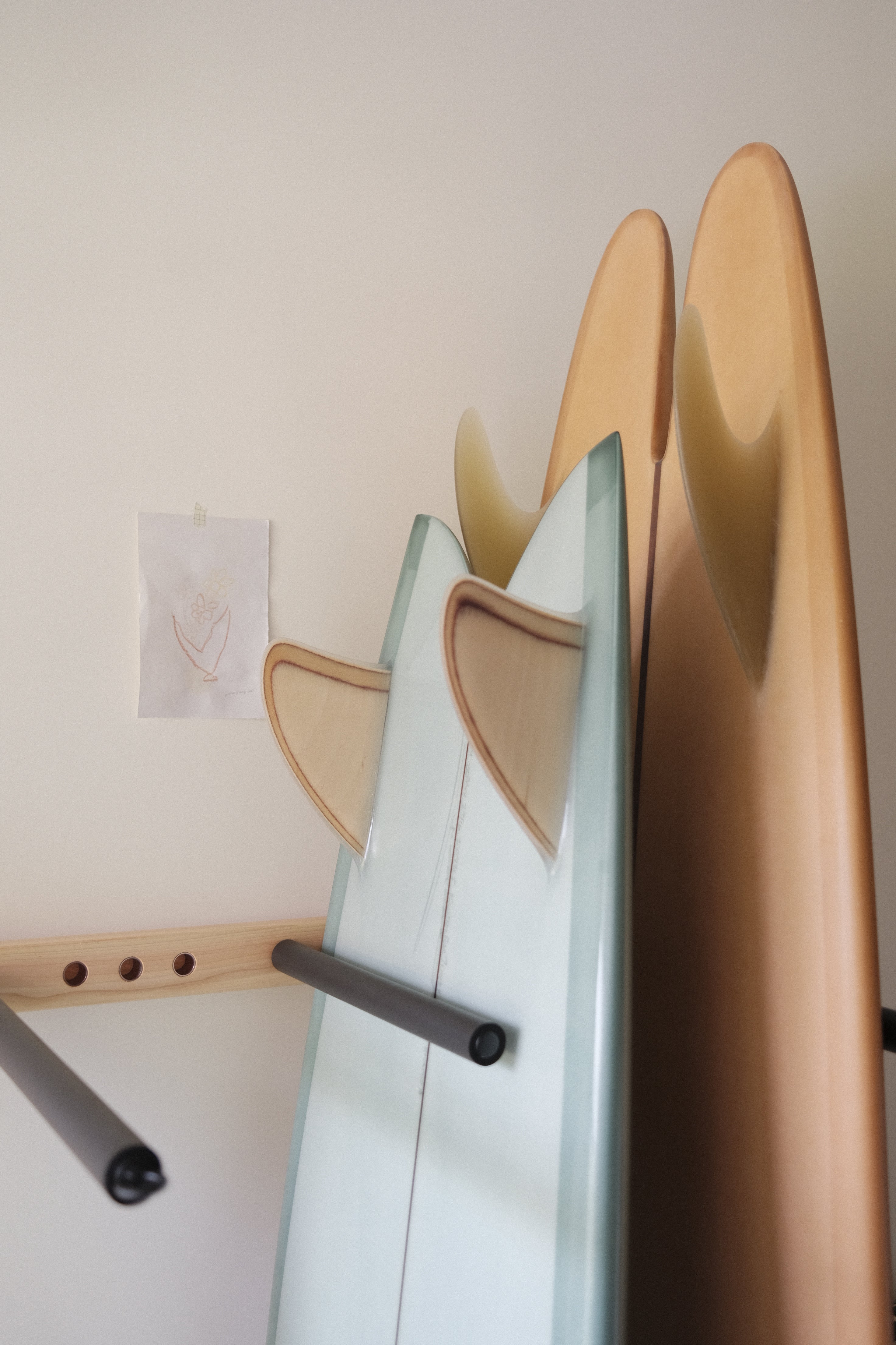 Minimalist board storage, designed to hold well-loved boards inside homes of all sizes.