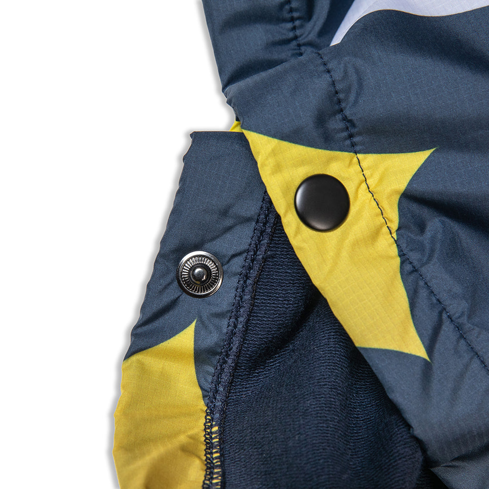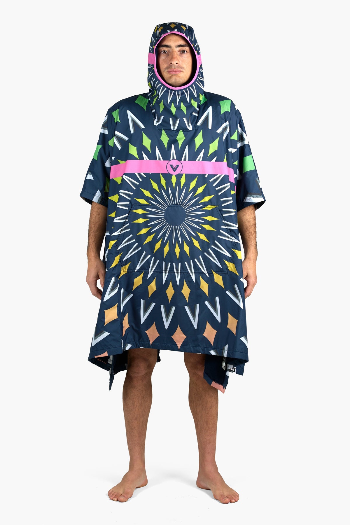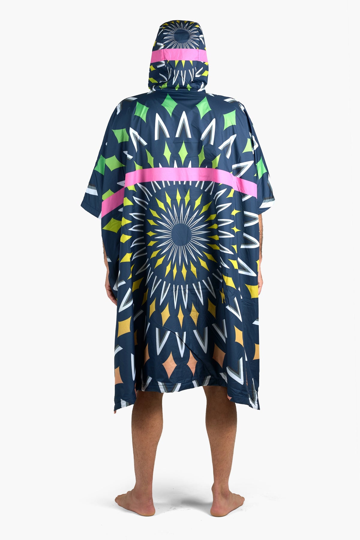 Built for the elements on the beach or in the streets.  The shell of our poncho is made of 100% poly rip stop to keep the wind and moisture out.  And the 100% terry cotton liner will keep you warm.  Oversized kangaroo pocket up front.  Snap buttons allows the poncho to completely open up. Model is 5'10
