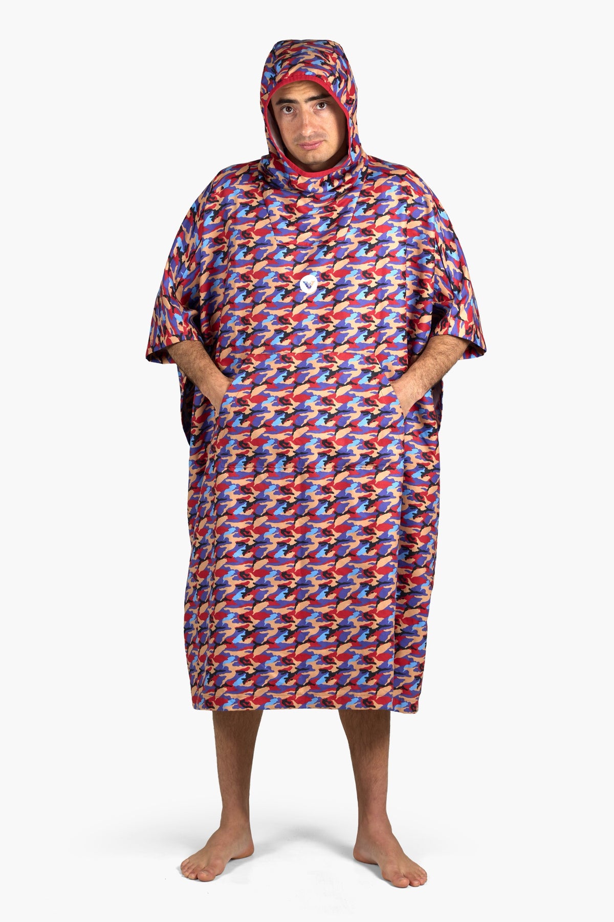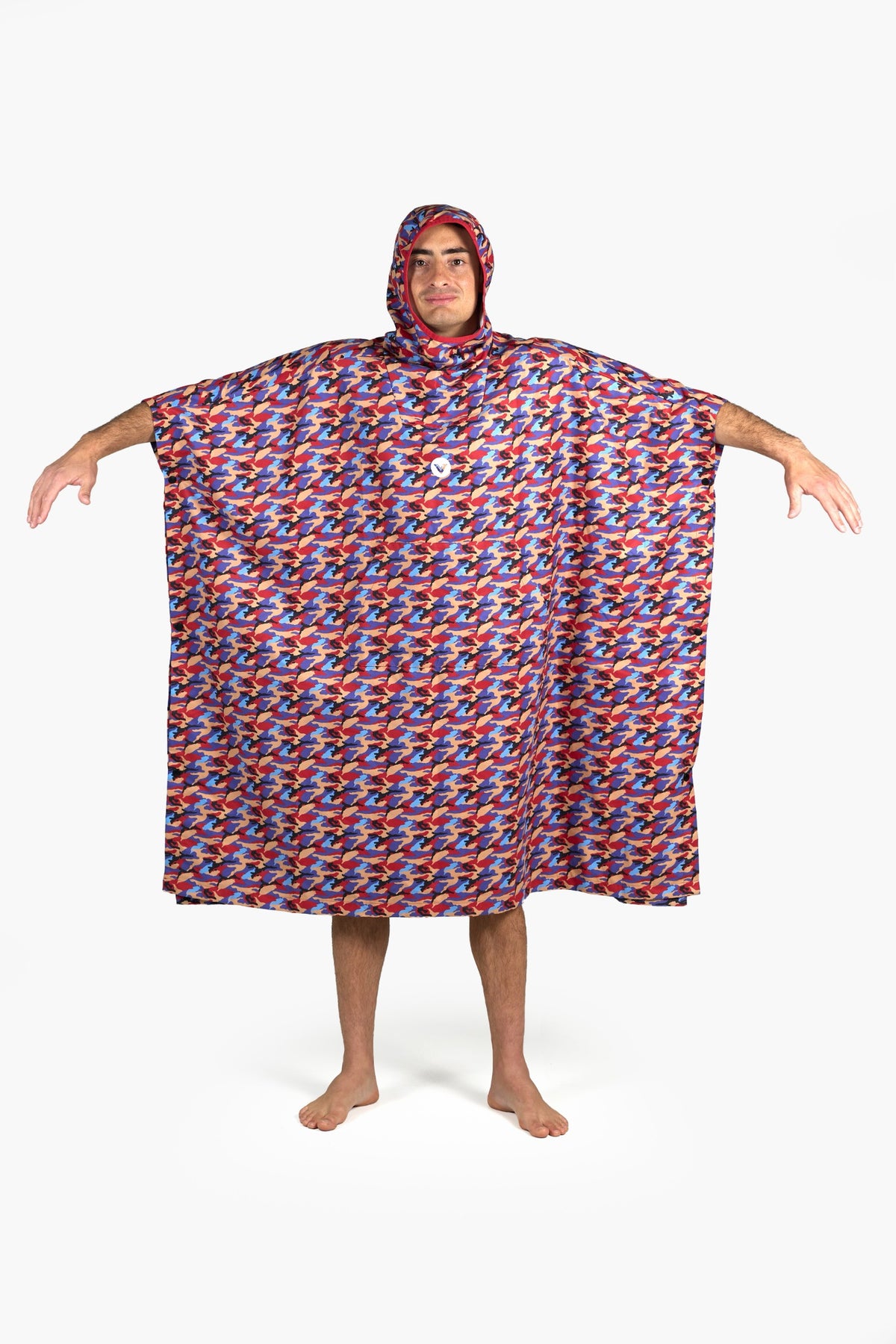 Versatile hooded poncho design with front pouch hand pocket at center. Reliable protections against wind and weather. Full garment coverage camo pattern with Vast circle logo at center chest and Vast rectangle logo on lower left corner. Available in Formosa Orange. Model is 5'10