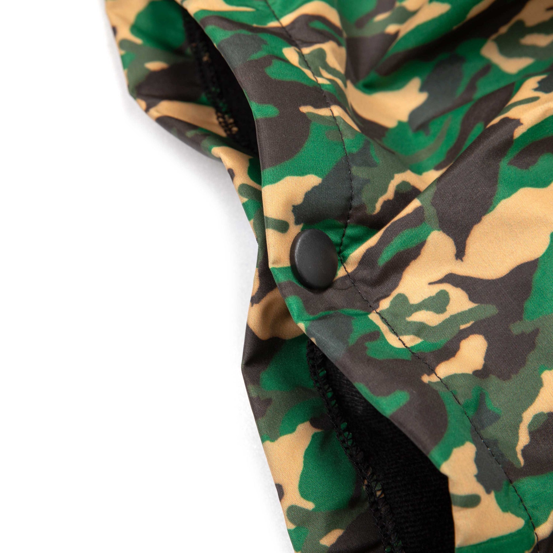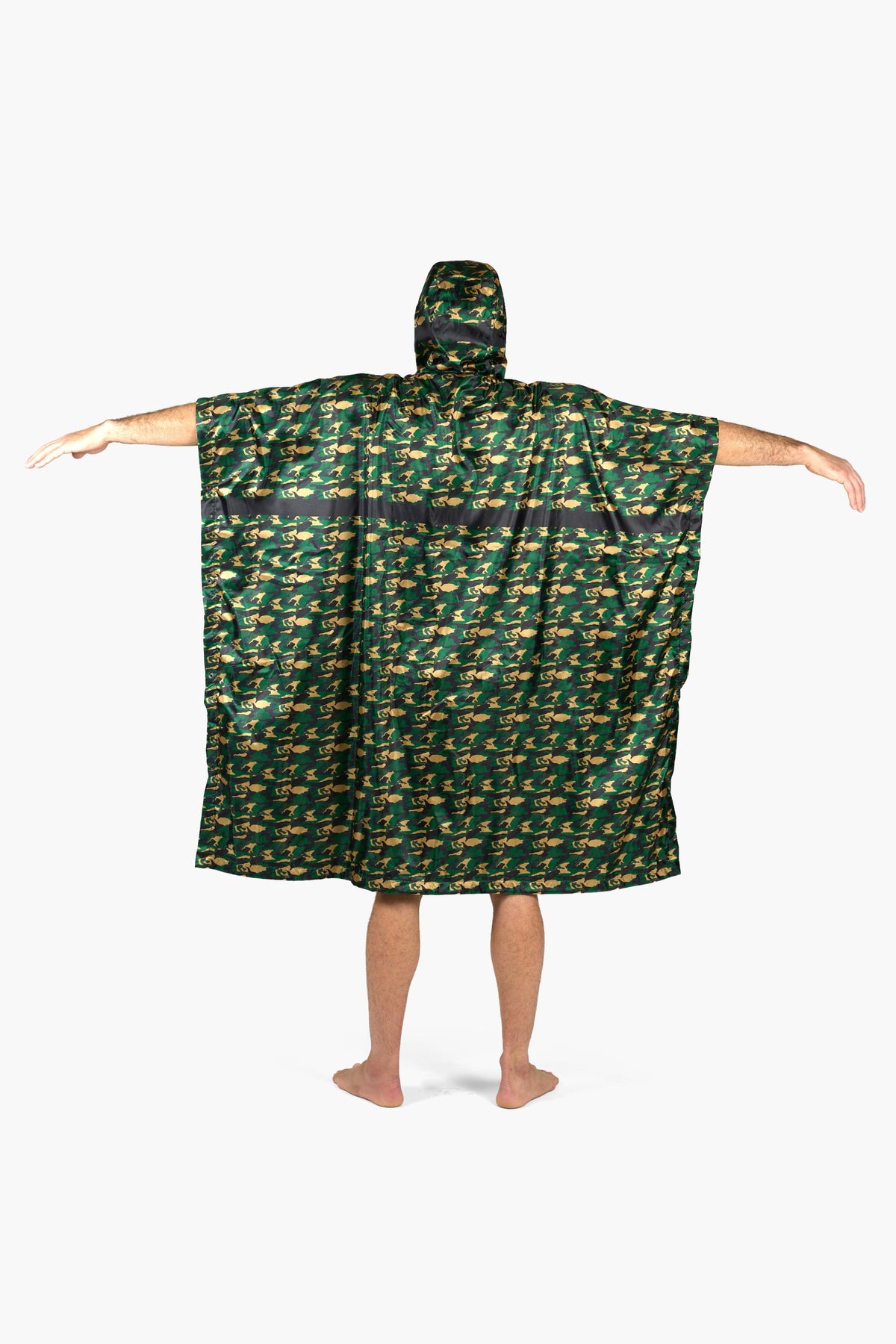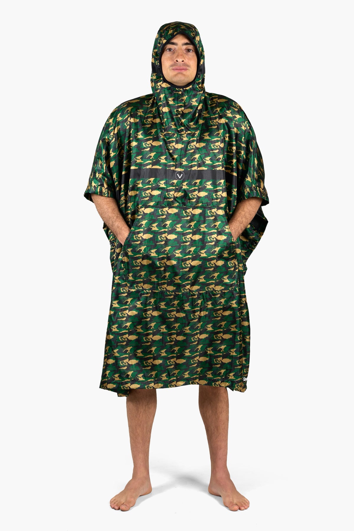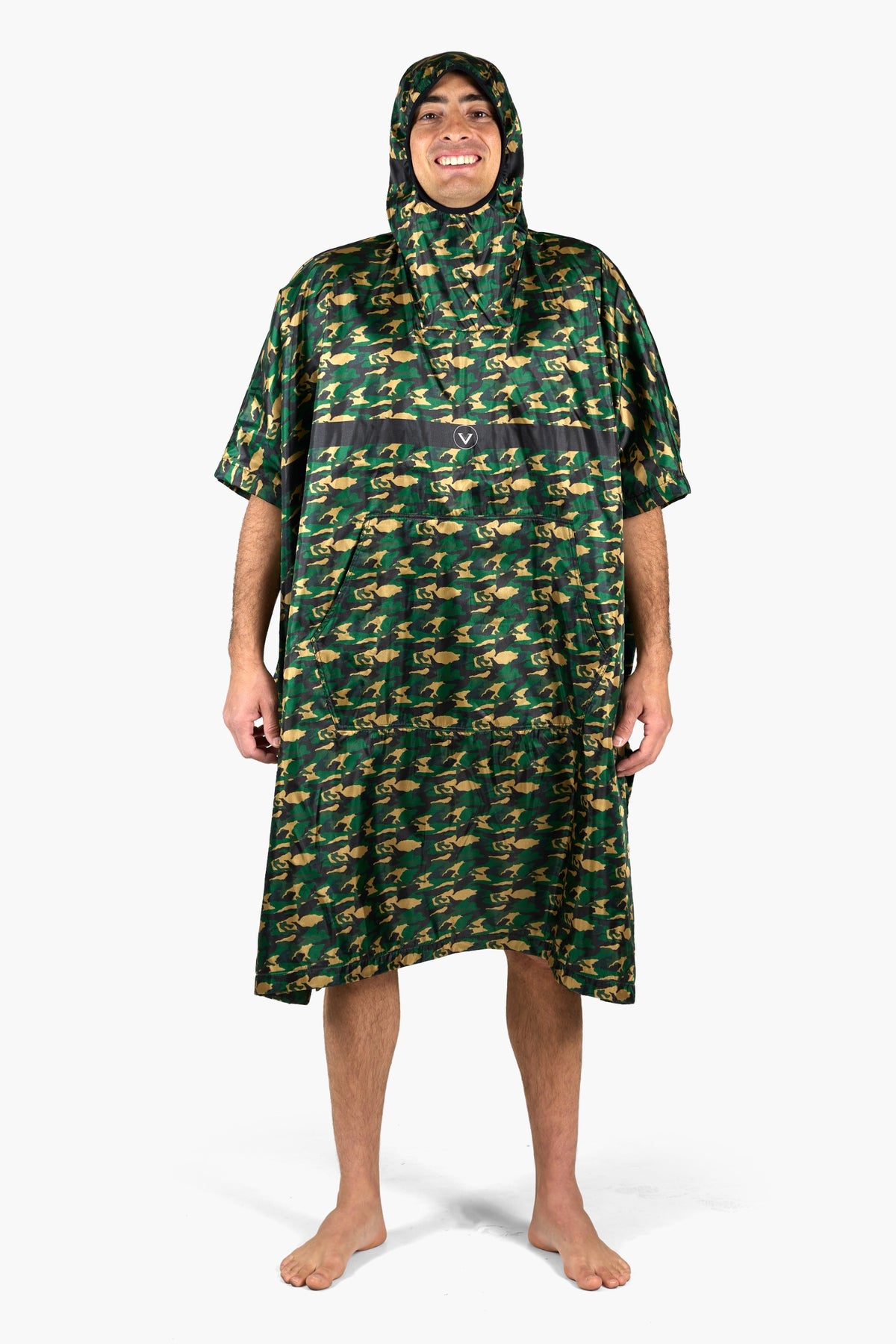 Versatile hooded poncho design with front pouch hand pocket at center. Reliable protections against wind and weather. Full garment coverage camo pattern with Vast circle logo at center chest and one horizontal black stripe. Side seams, drawstring bottom closures, Polyester shell with Cotton lining. Available in Camo. Model is 5'10