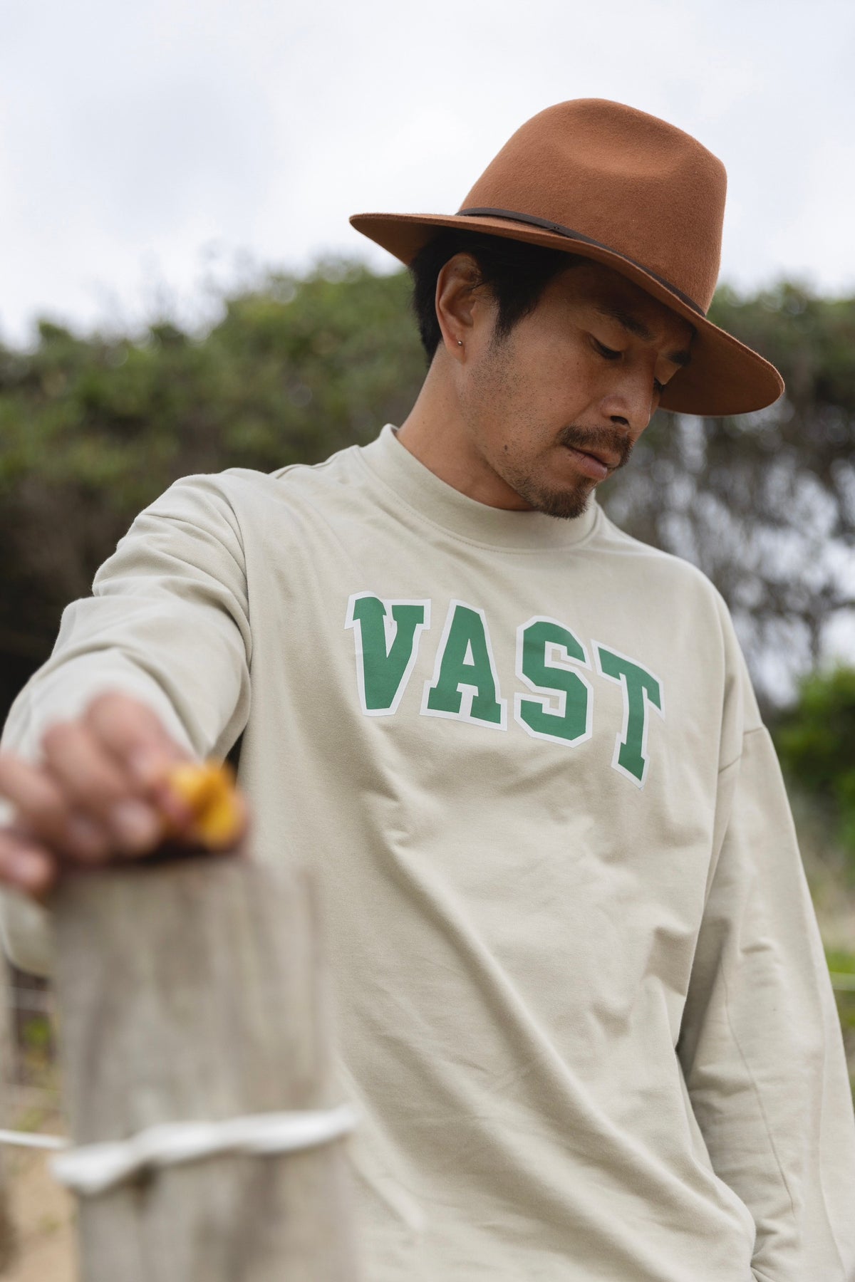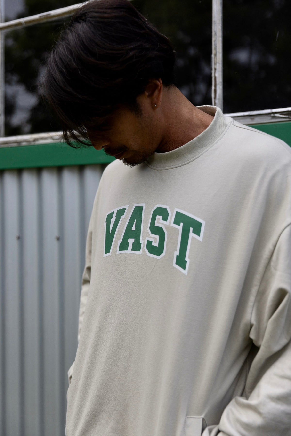 Simple VAST crew pullover sweater. VAST Athletic Font printed across chest. Printed on our premium Cotton Poly blend pullover crew neck sweater. Dual front hand pockets, side seams and flat overlock v-stitch on the collar to control stretching during pullover. Comfy 90% Cotton 10% Polyester blend with standard ribbed bottom and cuffs and Vast elements logo patch on bottom right hip. Available in Tan and Green.