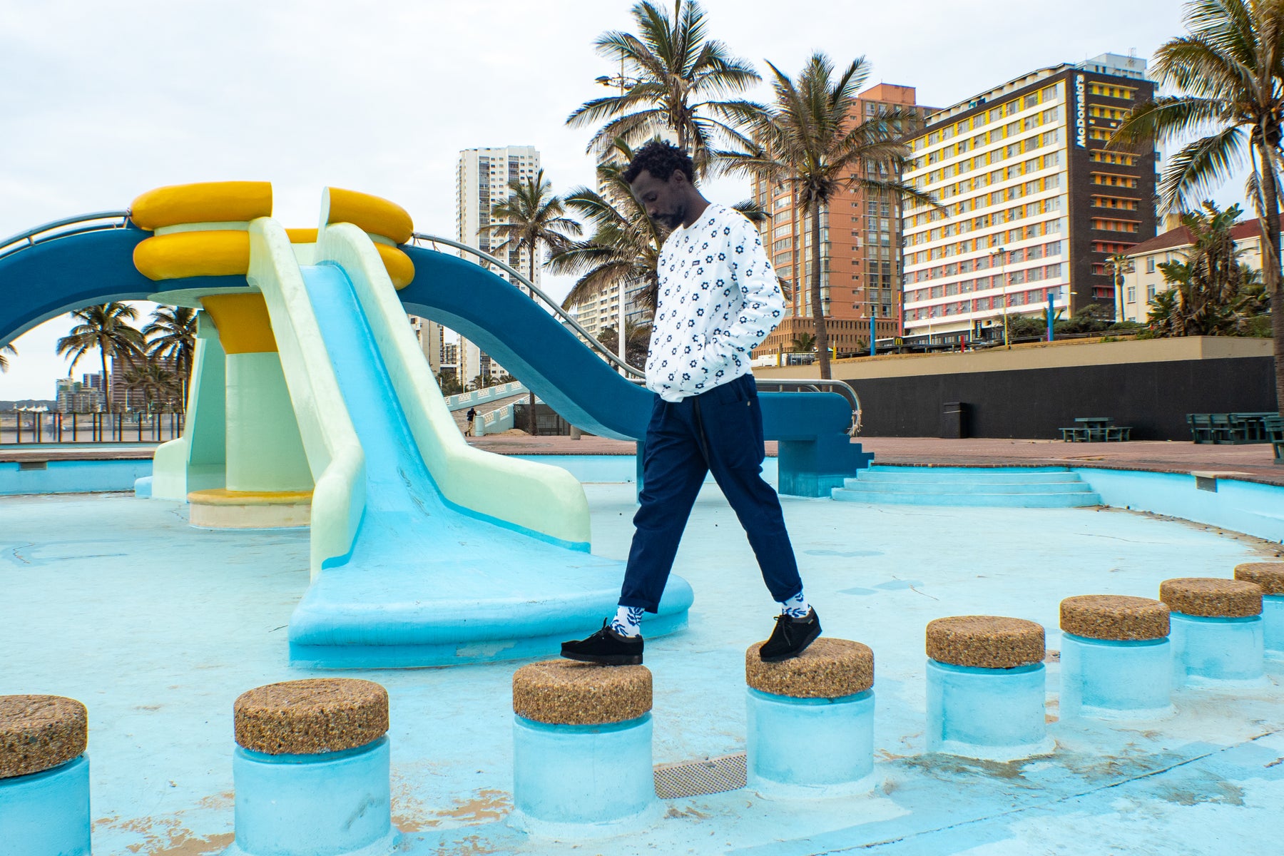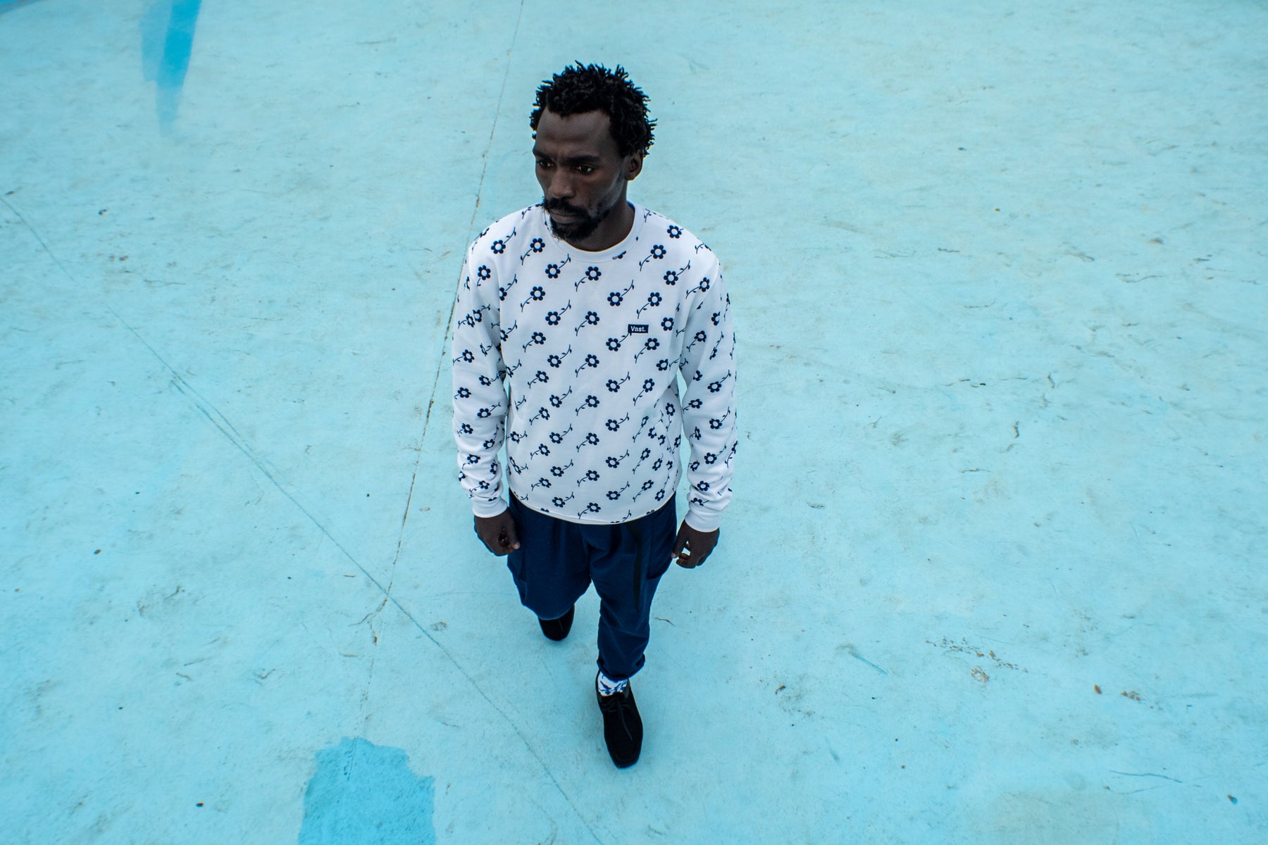 VAST embroidered graphic floral crewneck pullover featuring an all-over embroidered graphic floral pattern with a box logo on front chest and back neck. Made from 100% recycled polyester, includes dual front hand pockets, side seams, and a flat overlock v-stitch collar to prevent stretching. It has ribbed cuffs and hem. Available in Navy and White.