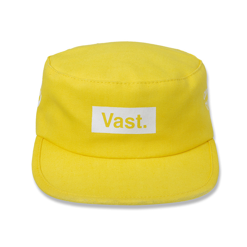 The Vast block logo printed on the front, and climate change printed on the left side. Stay visible in the 100% cotton painter's hat in yellow. The velcro strap in the back allows you to adjust the hat size for a secure fit.