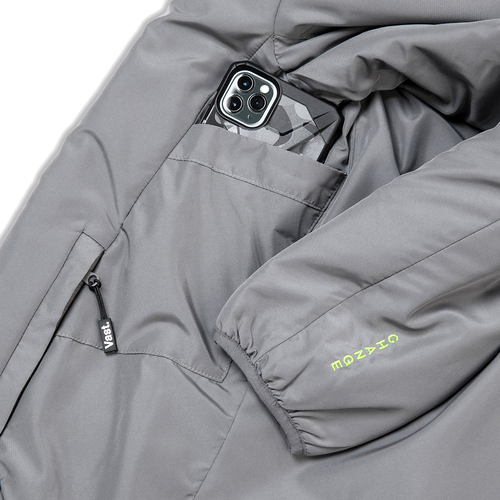Versatile, sleek and perfect for wearing out at night or layering up during the colder months. Designed with a classic bomber jacket silhouette that includes a full button up closure, two front hand pockets, Branded Natural Elements on inside wrists and stylish Vast circle logo on left chest. Water and wind resistant, 100% Polyester, available in Charcoal and Red.