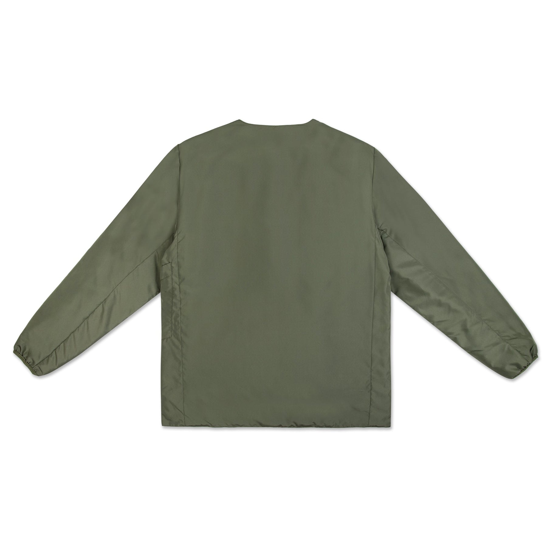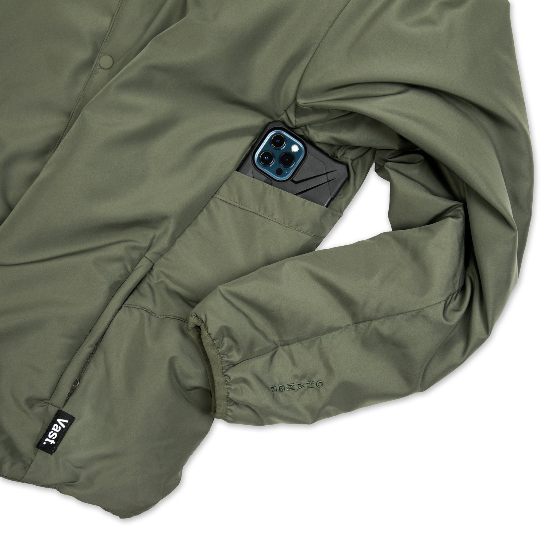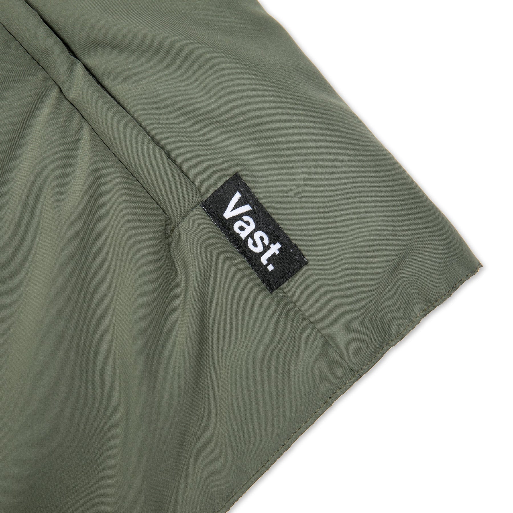 Versatile, sleek and perfect for wearing out at night or layering up during the colder months. Durable and water resistant puffy jacket. Designed with a classic bomber jacket silhouette that includes a full button up closure and two front hand zip pockets. Minimal branding with Vast circle logo on front left chest and Vast block tag on left hip. Water and wind resistant, 100% Polyester, available in Dark Olive and Steel Blue.