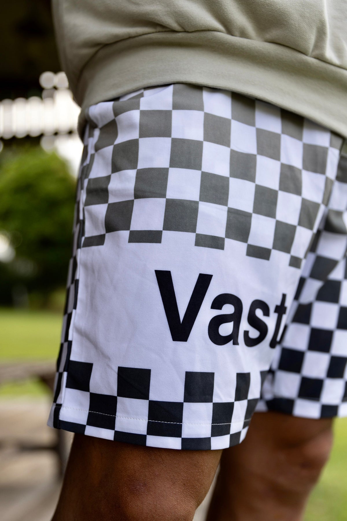 Our classic, simple walk shorts in a fun checkerboard all over pattern ombre from top to bottom. Dual side hand pockets, rear pocket with button flap and 9" inseam. Vast block logo on front left knee, Vast. logo on right thigh with belt loops. Made of 55% Cotton, 41% Polyester and 4% Spandex. Available in Checkered Ombre.