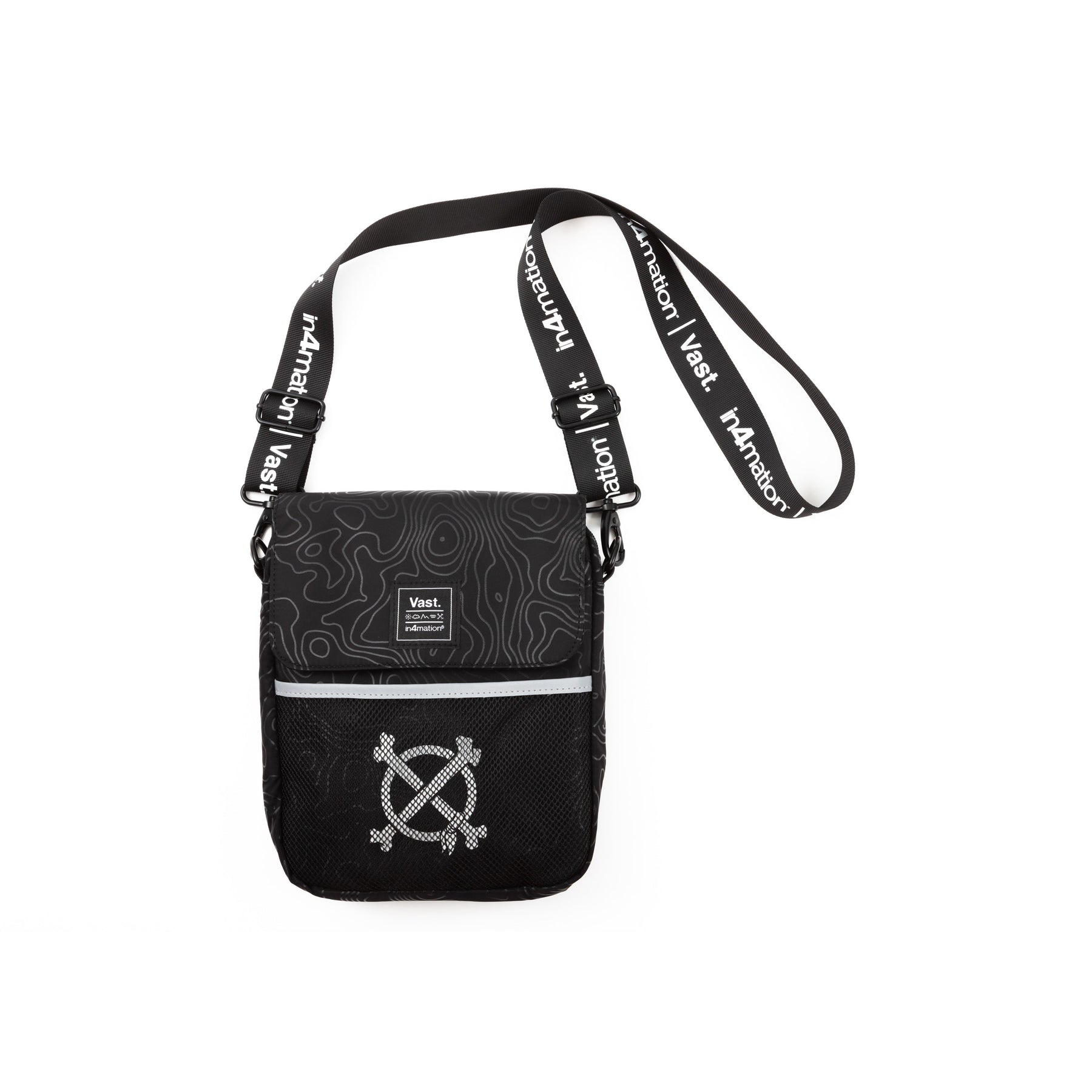 Never lost and always on time. This handy bag features two zip compartments to stow what you need. Subtle geometric mapping pattern with an overlapping velcro cover. Made of durable 100% Nylon with an adjustable strap that can also be removed completely from bag. Vast x IN4 square logo on cover, IN4 and Vast logos on strap and IN4 Crossbones logo under front mesh pocket.