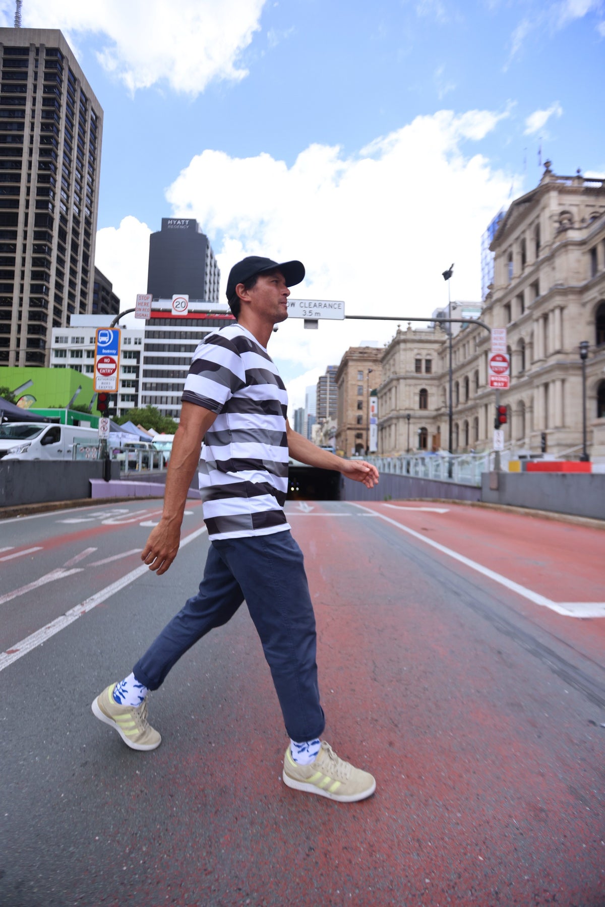 Abstract Lava lamp inspired horizontal striping on our UV protection surf shirt featuring AquaTerra moisture wicking fabric with Vast Vintage logo on left chest. Protect yourself from the elements in this lightweight water tee made of 96% Polyester and 4% Elastane blend. 30+ SPF sun protection. Available in Black.